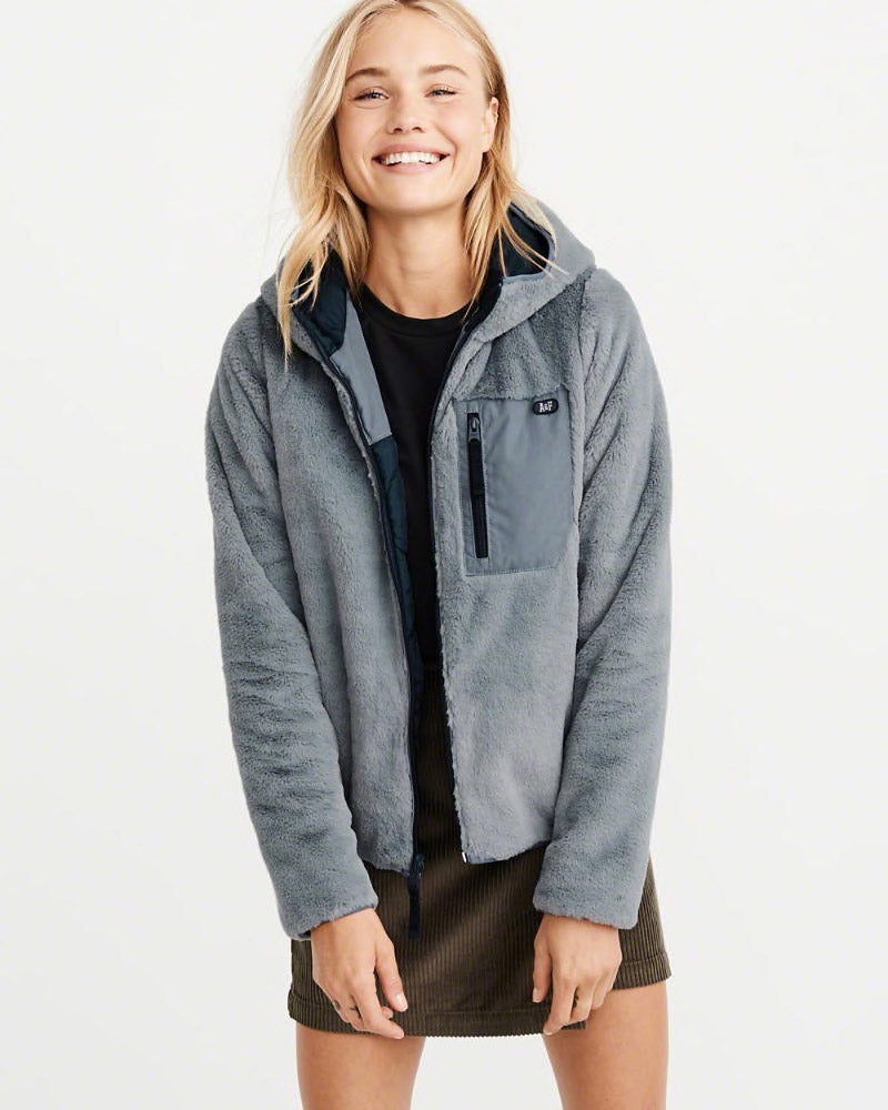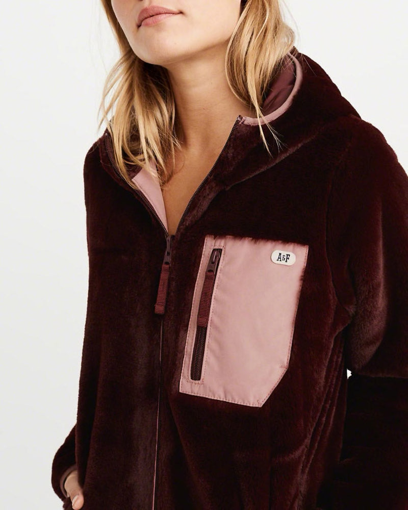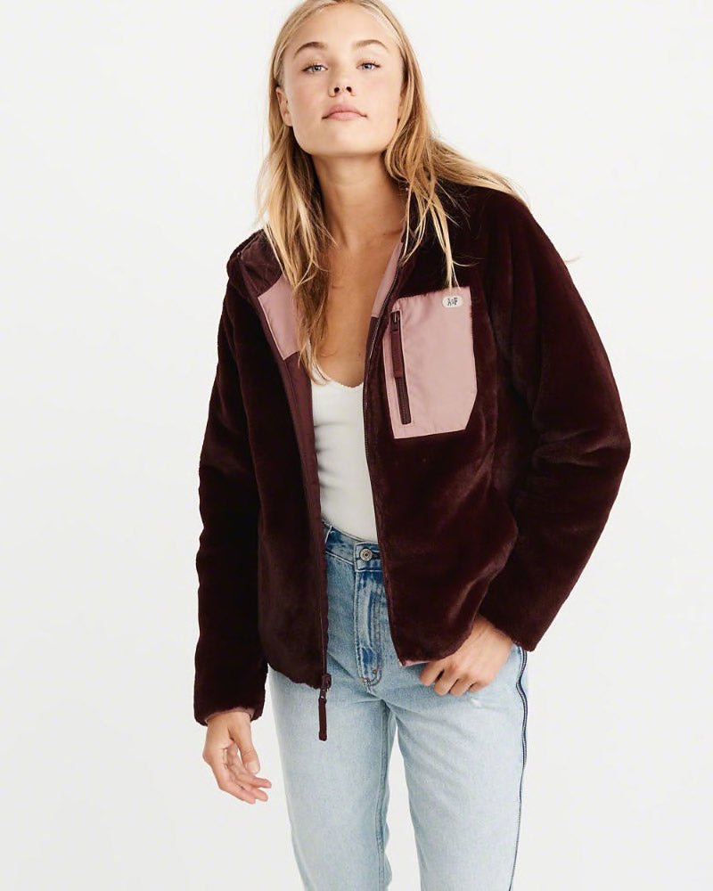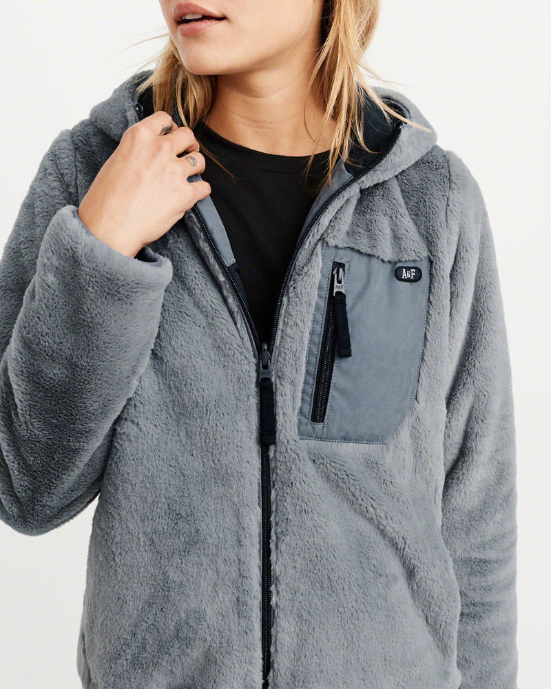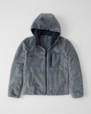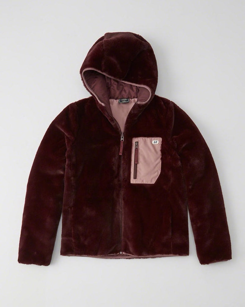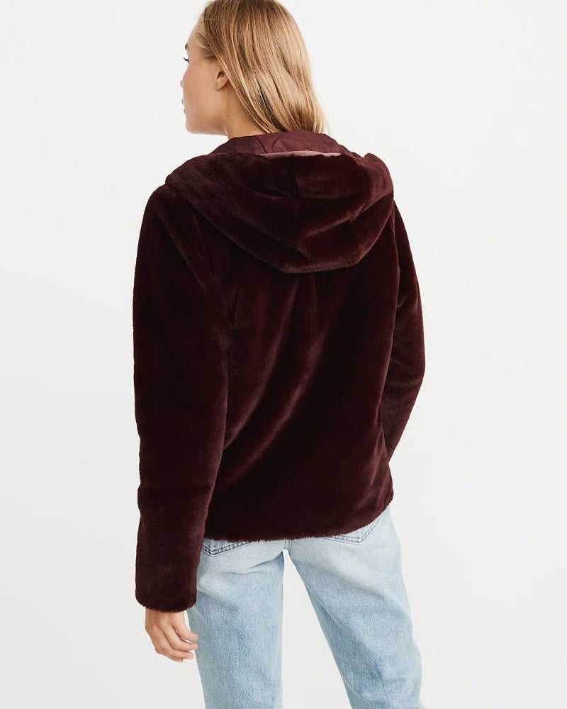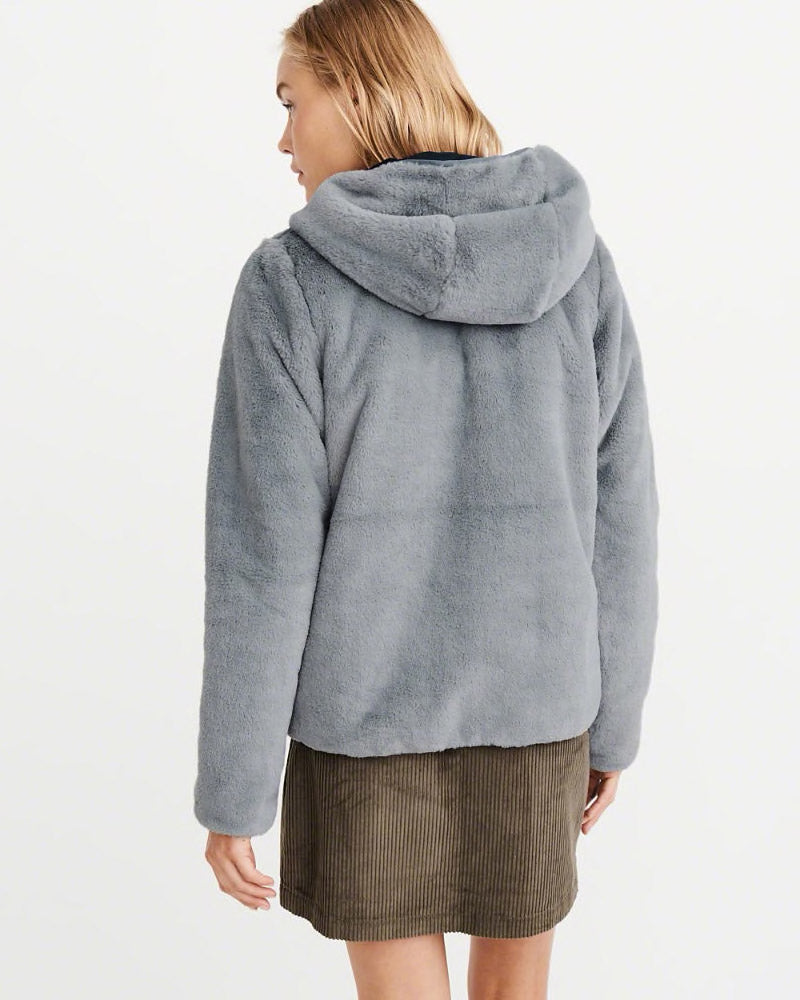 Cozy jacket in a soft faux fur fabric with a full-zip front, side-slit pockets, chest zipper pocket and hood. Reversible!